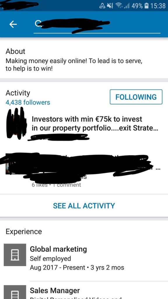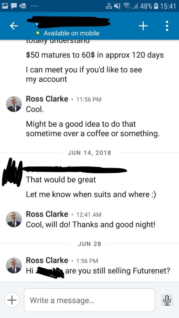 Jane Doe seemed trustworthy when I chatted with her on LinkedIn. She assured me that FutureNet was a risk-free enterprise, and she confirmed to me that she had already yielded €17,000 from FutureNet herself. This was pretty compelling stuff, and I was wavering on the edge of parting with my cash. Yet I felt that something just wasn’t right. It seemed too good to be true, and the video she sent me was just a little too optimistic as it was suggesting that one could make millions in a relatively short period of time. The outrageous figures sparked alarm bells in my mind, but if they had of been a little more humble, or if I had of been a little less inquisitive, I’d have been sold.