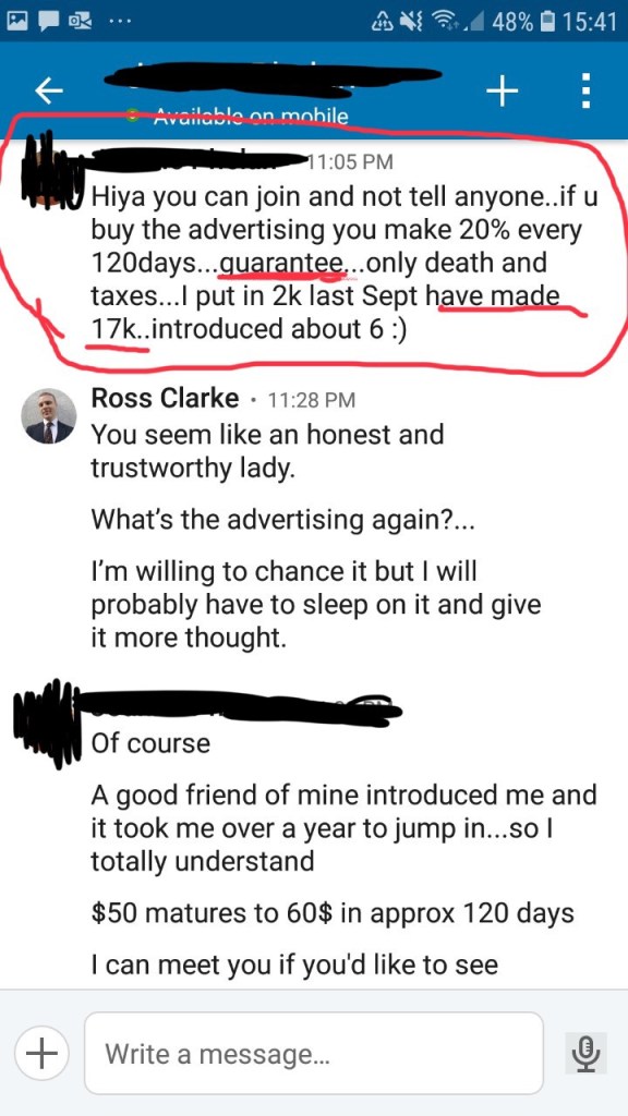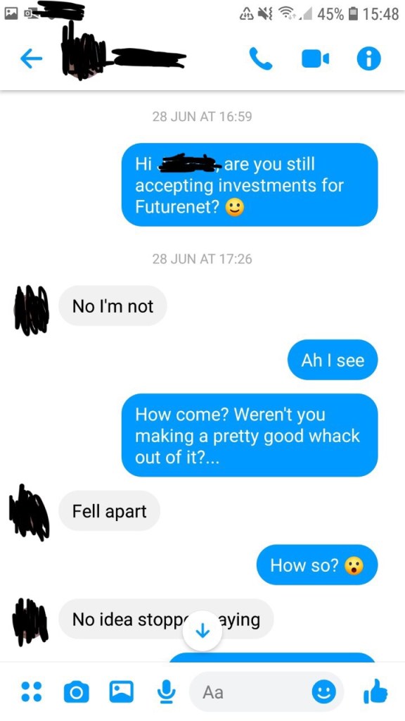 As can be seen from the conversation above; Jane Doe had invited me to meet her in person so that she could “show me” the infallible wonders of investing with FutureNet. There was also an offer to join a Whatsapp group. In hindsight I now consider myself very lucky to have missed such appointments. I did want to meet her, and it is possible that a persuasive face-to-face meeting would have quelled my doubts about FutureNet, but fortunately there were other aspirations taking precedence in my life at that time. However, this was not the last time I heard from Jane Doe.