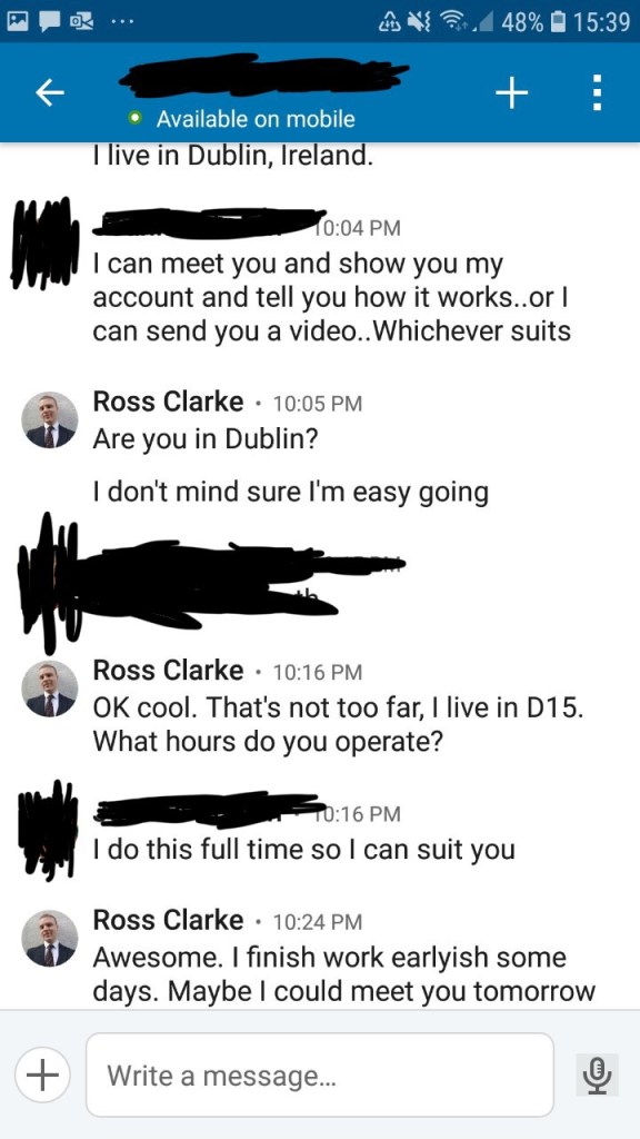 Less than two months later she reached out to me on Facebook and invited me to a live FutureNet presentation in Drogheda, Co Louth. Playing altruism she ensured me that there was “too much money to be made” and that it would be in my best interest to check out the event. Thankfully this was another outing that I did not attend as I have no doubt that it was absolutely beguiling.